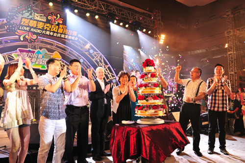 庆生节目过半时,伴随着温謦的音乐和全场热烈的掌声,一只2米多高的超大蛋糕被推上了舞台,鲜花彩纸从天而降,全场观众与参加今晚盛宴的歌手和乐队齐声歌唱《祝你生日快乐》,至此LOVE RADIO台庆六周年的庆生演唱会被推向高潮。