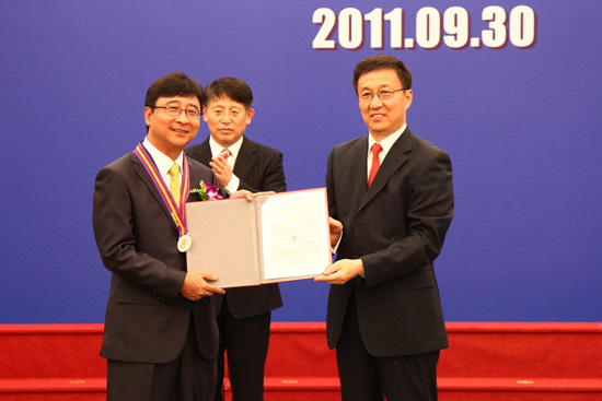 9月30日,2011年上海市“白玉兰荣誉奖”授奖仪式在人民大厦举行。东方希杰总经理金兴守获此殊荣,上海市市长韩正亲自向金兴守总经理颁授证章和证书。