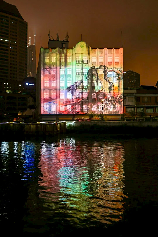 在极具海派文化代表性的苏州河岸,以光影“重生”岭南画派艺术大作,一幅幅色彩鲜艳、生机勃勃的“水墨花园”倒映在温婉的潺潺流水上,形成了奇妙的和谐反差,海派的万千气象与岭南的“折衷中外、融汇古今”精神也在此得以贯通呈现。