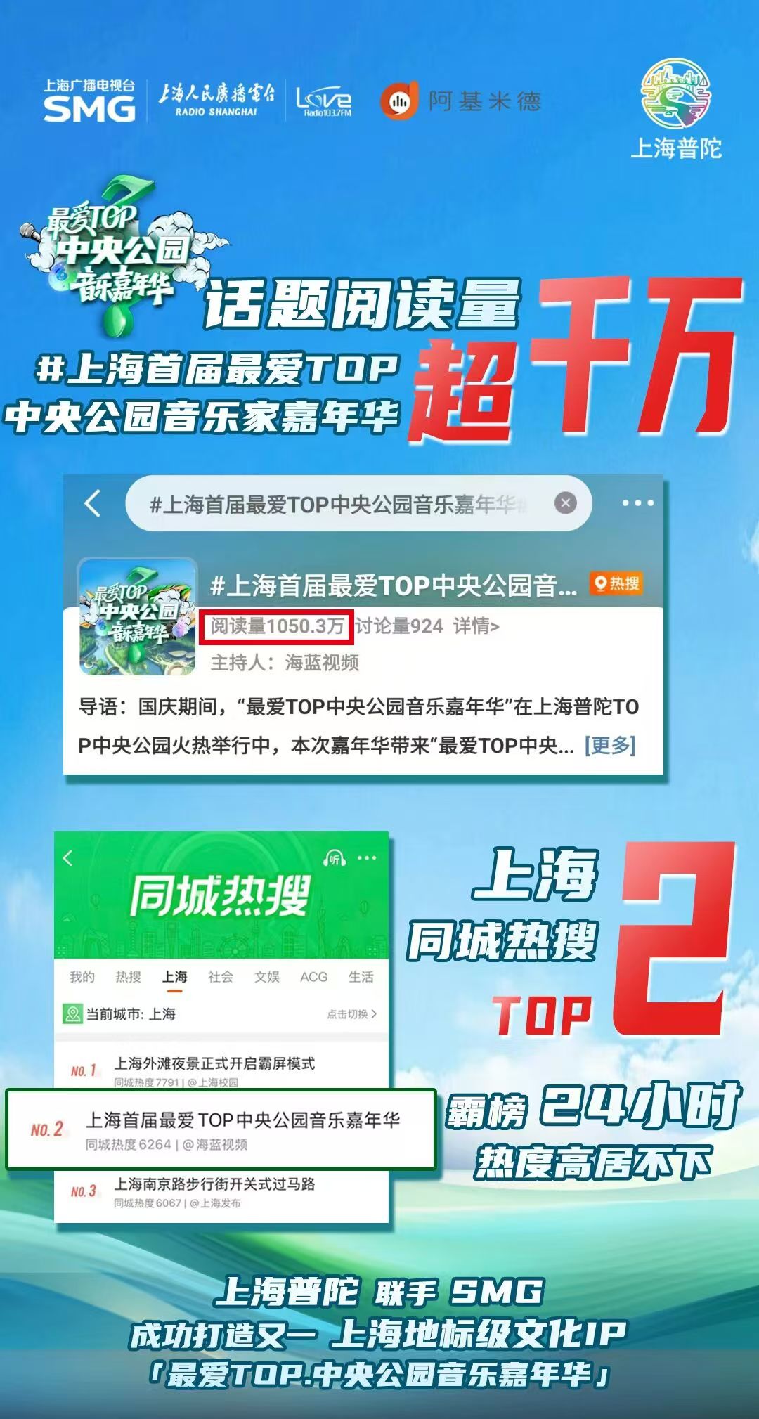 音乐节主话题“首届最爱TOP中央公园音乐嘉年华”、 副话题“上海普陀房车音乐节”阅读总量超1200万,主话题登上海同城热榜第二。