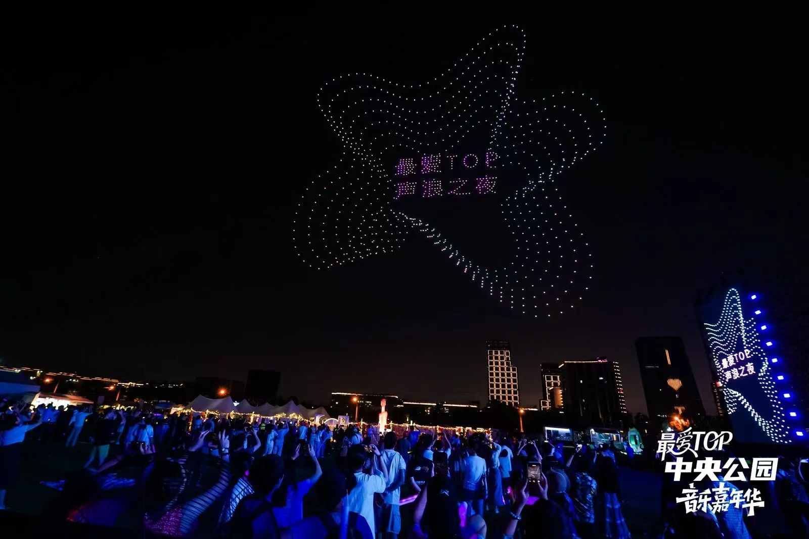 10月5日-6日晚,普陀区属科创企业为最爱TOP.中央公园音乐嘉年华房车音乐节带来了压轴演出——“TOP星幕”无人机表演。