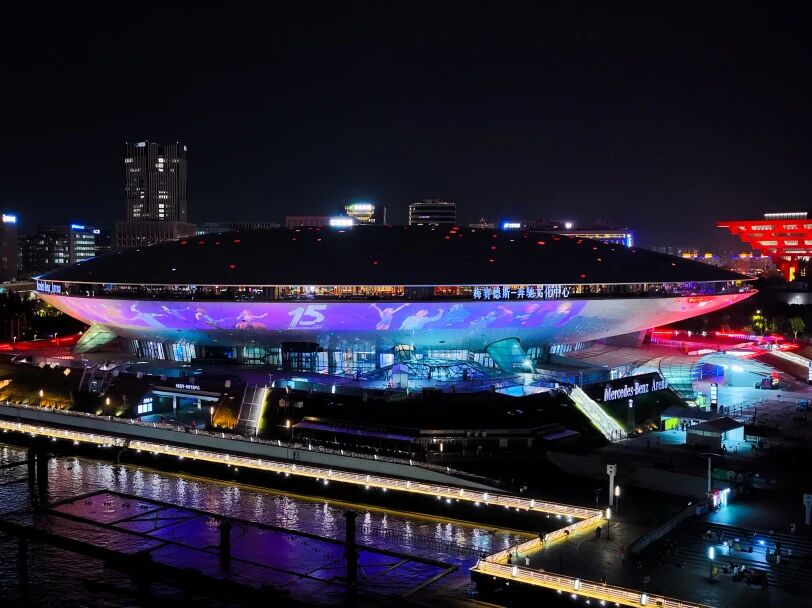 场馆同步深度融入上海国际光影节,推出“光・启未来”主题光影秀,已播放38场,融入上海天际线、梅奔中心15周年主题等元素,更上线AR烟花打卡秀,游客通过场馆小程序扫描“飞碟”建筑即可触发虚拟烟花绽放,打卡还能领取商户优惠券,双重光影体验让场馆成为黄浦江畔热门打卡地,实现“看演出、赏光影、享消费”的假日体验闭环。