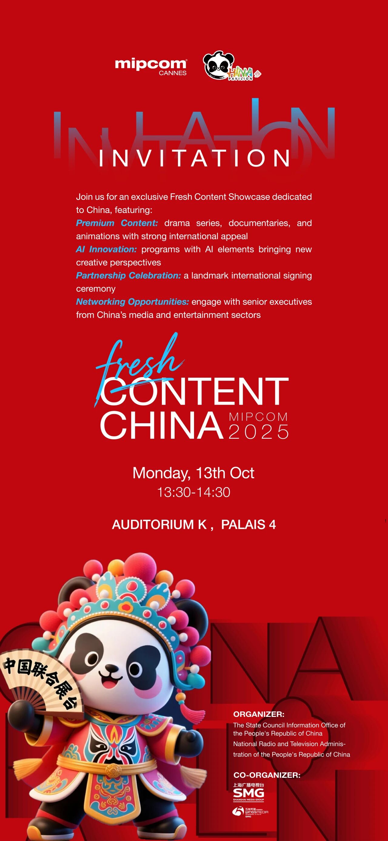 2025年法国秋季戛纳电视节(MIPCOM)将于10月13日至16日在戛纳影节宫举行。由国务院新闻办公室、国家广播电视总局指导,上海广播电视台(上海文广集团)主办,东方明珠旗下上海五岸传播有限公司承办的法国秋季戛纳电视节(MIPCOM)“中国联合展台”(展位号:P-1.G1)将再度精彩呈现,以180平方米的展出面积,汇聚15家中国优秀视听内容制作、发行与播出机构,集中展示近百部精品力作。