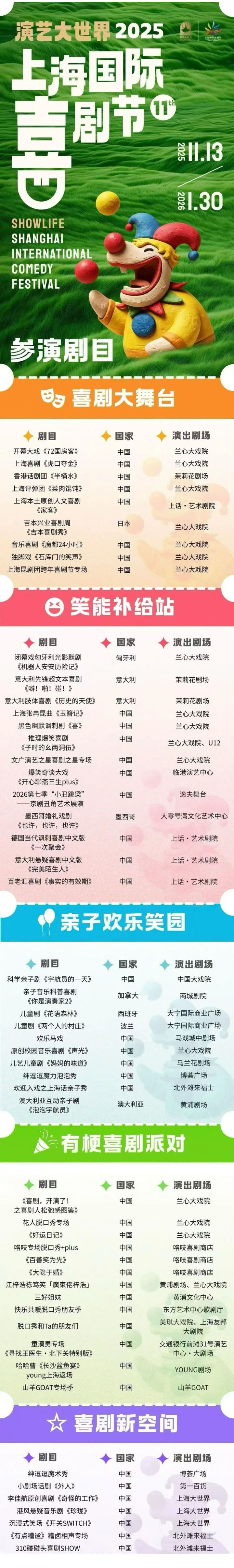 此外,《虎口夺金》《石库门的笑声》《声光》《开心聊斋三生plus》《完美陌生人》《外人》等五十余部喜剧也将连番上演。