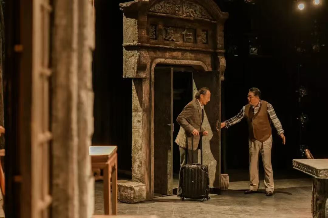 舞台布景简约而富有表现力:一栋坐落于上海高楼环伺之下的带院平房,既是主人公记忆的载体,也是一种坚守的姿态。多媒体投影以流动的笔触映照情绪变迁,时而苦涩,时而明快,时而压抑。屋顶的沙漏不断旋转、移动,配合房屋结构的拆解与重组,带领观众穿行于交错的时空中,体味人生的无数可能。