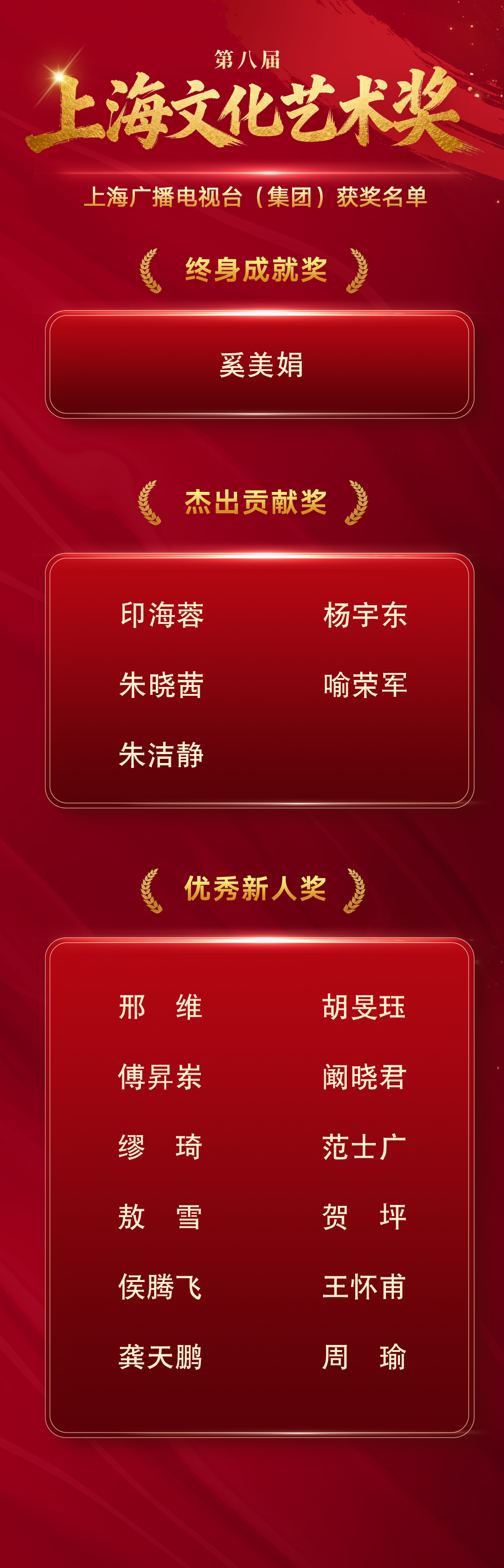 第八届上海文化艺术奖表彰座谈会今天(12月29日)上午举行。上海广播电视台(上海文广集团)共有18人荣获“上海文化艺术奖”,其中奚美娟获“终身成就奖”、印海蓉等5人获“杰出贡献奖”、邢维等12人获“优秀新人奖”。(详细名单附后)