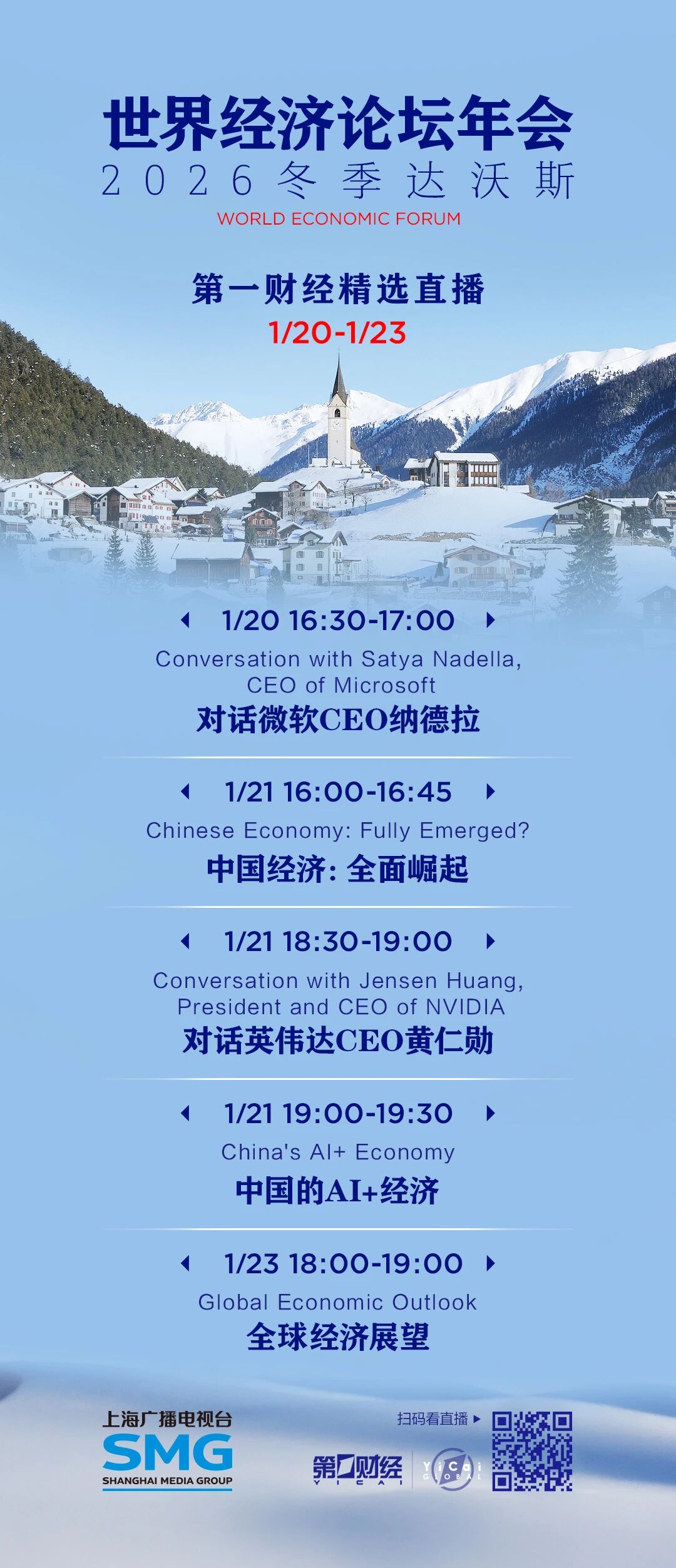 1月20日至23日,第一财经将通过新媒体端连续直播大会重点会议,包括:《全球经济展望》:国际货币基金组织(IMF)与世界银行高层对话;《中国经济:全面崛起》:中国代表团专场,解读“十四五”规划与全球合作;《中国的AI+经济》:百度、商汤科技等企业分享AI技术落地案例;《对话英伟达CEO黄仁勋》:探讨AI芯片与算力基础设施的未来;《对话微软CEO纳德拉》:聚焦云计算与数字化转型的全球机遇。