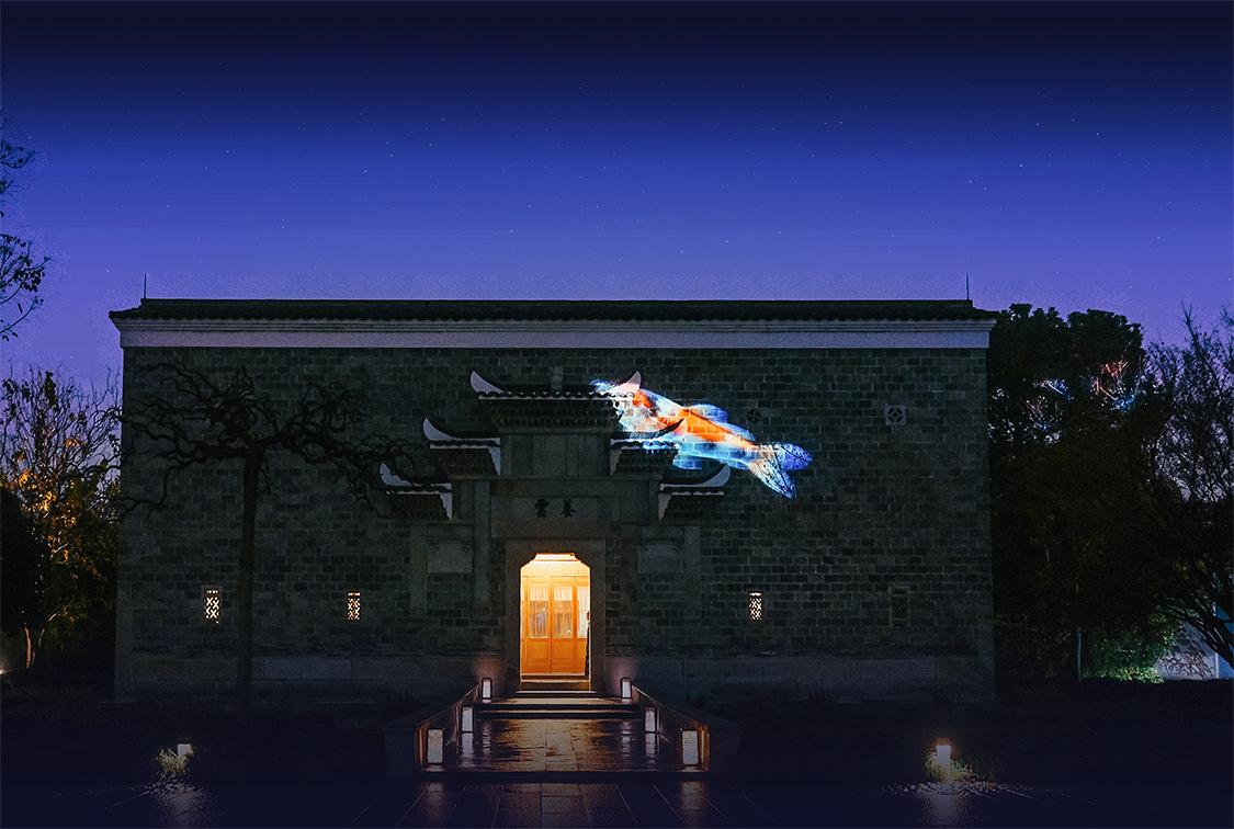 作为酒店文化核心的楠书房,其古朴的建筑立面成为光影流转的天然画布,与周边的古宅院落、静谧湖畔共同构成了兼具历史厚度与自然意趣的光影叙事空间。建筑立面上,几尾光影锦鲤悠然浮现,在虚实交融的水波间自在游弋。锦鲤所象征的从容与祥瑞,与庭院中千年古树的宏大叙事交相呼应,共同构筑出一幅动静相宜的安缦夜景。