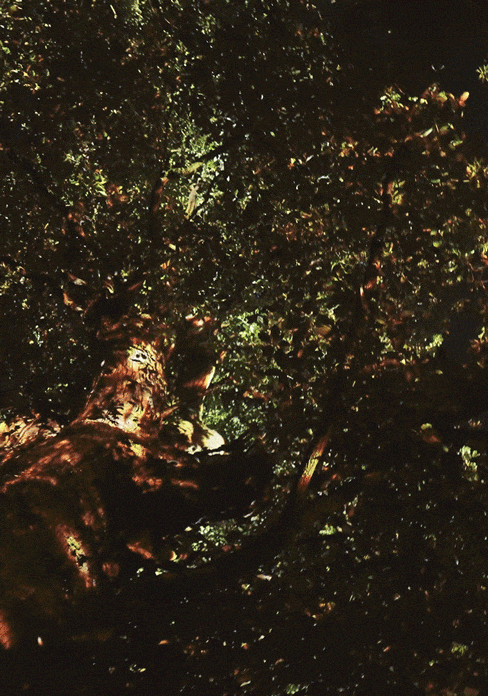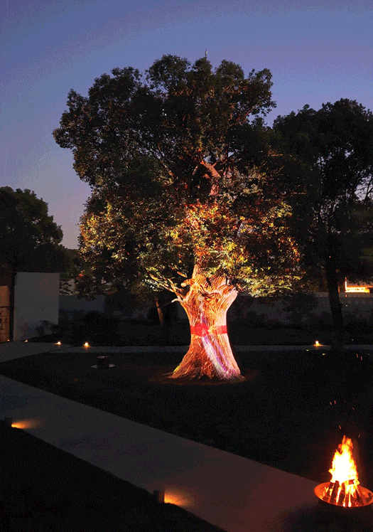 幻维数码围绕养云安缦酒店独有的古建园林展开创意叙事,利用多台高流明投影机,通过复杂的边缘融合技术,让光影完美贴合树干的每一寸肌理,仿佛光就是树生长出来的一部分。从地面而起的点点星光穿梭于叶隙间,最终汇聚成“日月共同”四个大字。用流动的光,在静谧的庭院中谱写出一首生命赞歌,展现“天地人和”的深远境界。