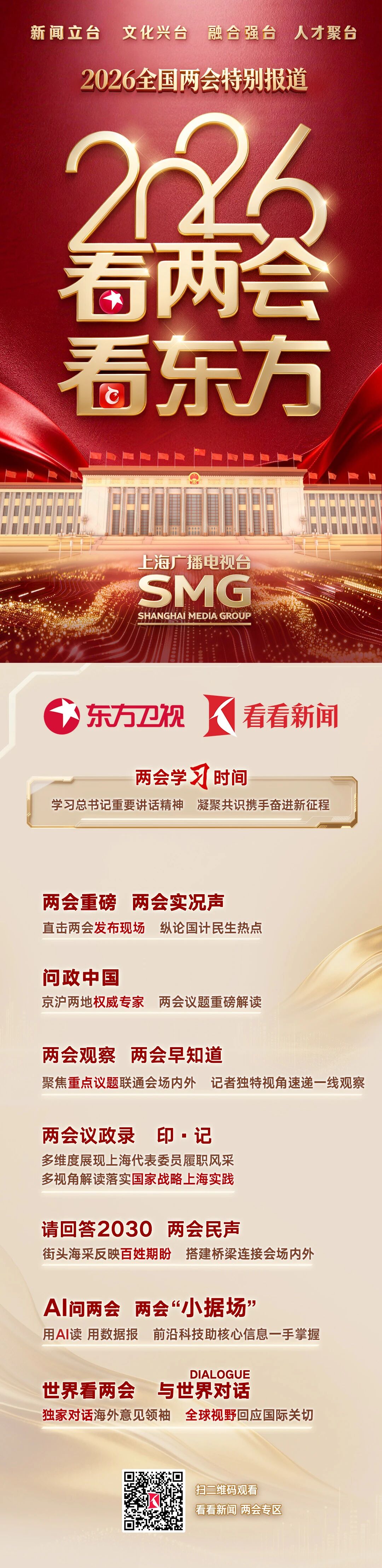 2026全国两会召开在即,上海广播电视台高度重视、集结精锐,精心组建45人前方报道团队奔赴北京,联动后方800人融媒体制作采编和技术保障团队,聚力打响“2026看两会 看东方”新闻品牌,用心用力打造好报道、好评论、好创意,彰显上海广播电视台的新闻制播专业能力和数智变革最新成果,为“十五五”开局之年召开的重要会议全力营造凝心聚力、团结奋进、一马当先的舆论氛围。