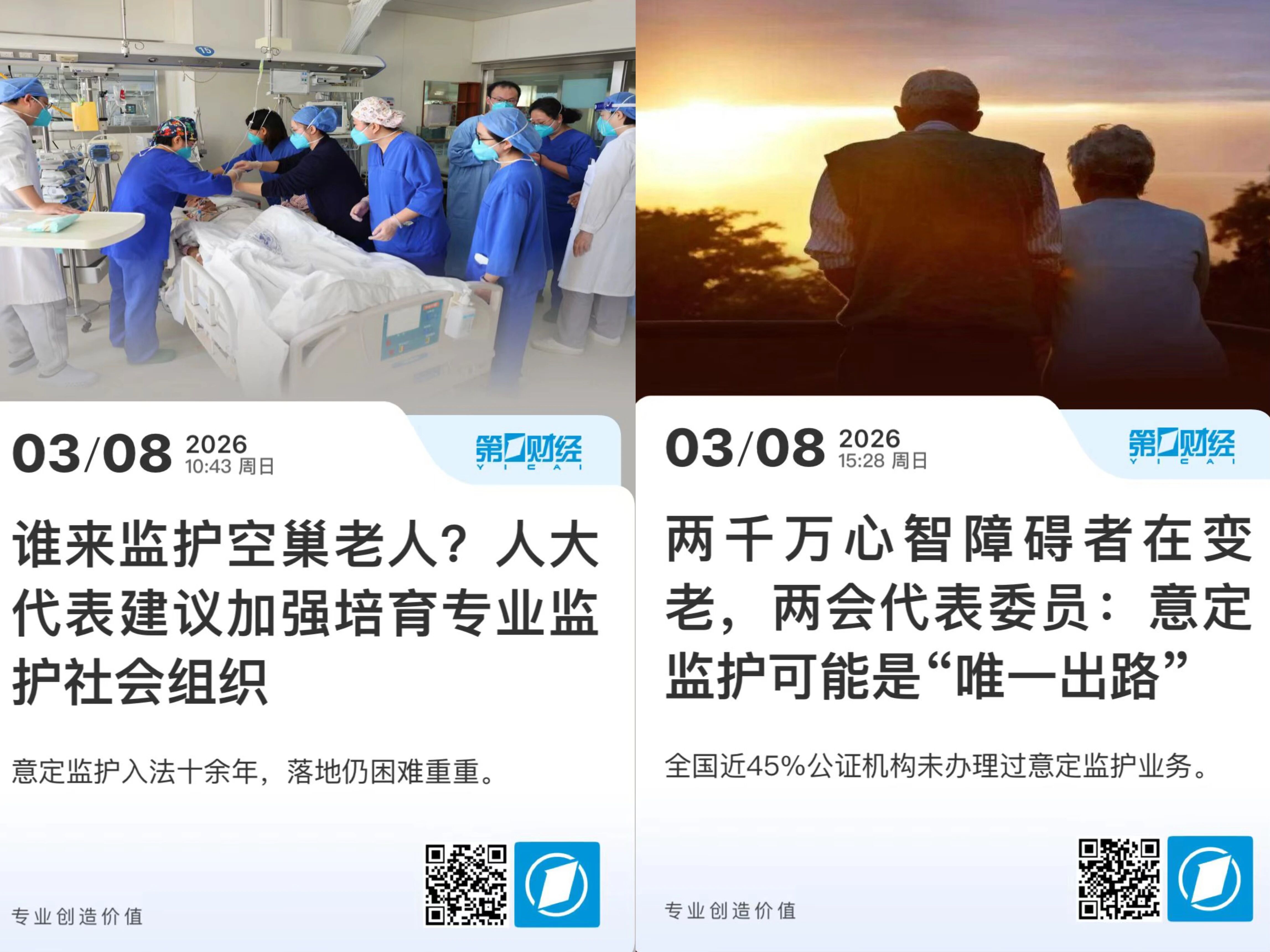 第一财经刊发《谁来监护空巢老人?人大代表建议加强培育专业监护社会组织》和《两千万心智障碍者在变老,两会代表委员:意定监护可能是“唯一出路”》两篇报道聚焦特殊群体监护困境,探索意定监护制度破局路径。两位代表直击痛点,指出了老龄化与少子化叠加背景下,特殊群体面临监护真空难题。同时通过详实调研揭示供给侧在专业组织、公证服务及托养资源上的三重短板,并以上海“财产三分离”等创新案例展现地方探索,提出完善立法、培育专业组织、搭建信息平台、推广信托与长护险等系统性解决方案。