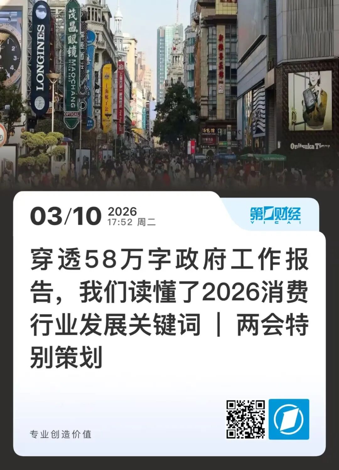 第一财经“两会特别策划”刊发长文《穿透58万字政府工作报告,我们读懂了2026消费行业发展关键词》,为洞察“十五五”消费产业航向提供指南。报道深挖政府工作报告和31省地方政府工作报告,在超58万字的政府工作报告文件汇总中,提炼出情绪经济、银发经济等七大高频词,从供给创新、场景激活双主线,图文并茂系统梳理消费从“量变”到“质变”的新逻辑。