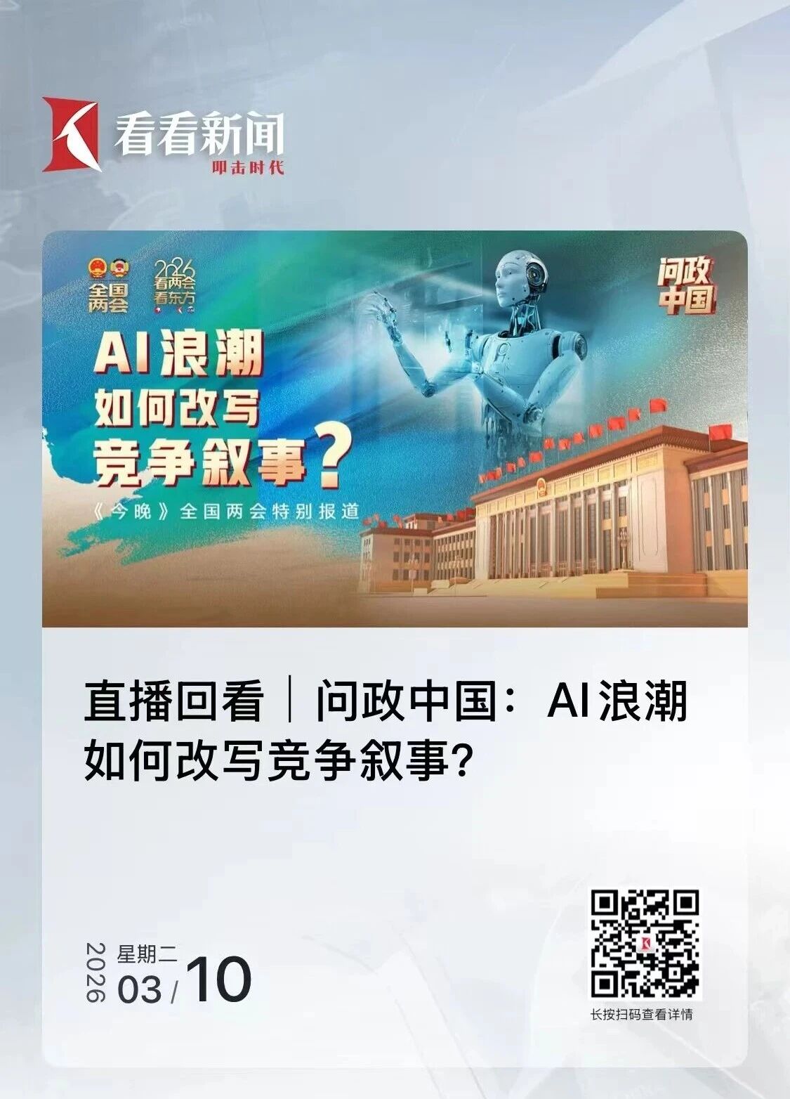 东方卫视两会专栏《问政中国》推出《AI浪潮如何改写竞争叙事?》深度评论,围绕两会AI热点,结合OpenClaw、Seedance等前沿技术突破,紧扣“布局智能经济新形态有何深意”“如何判断AI技术狂奔的监管风险”“中美在AI竞争中展现的新态势”等核心议题开展深度对话,阐释在“十五五”开局之年的关键节点,布局智能经济新形态的战略发展深意。