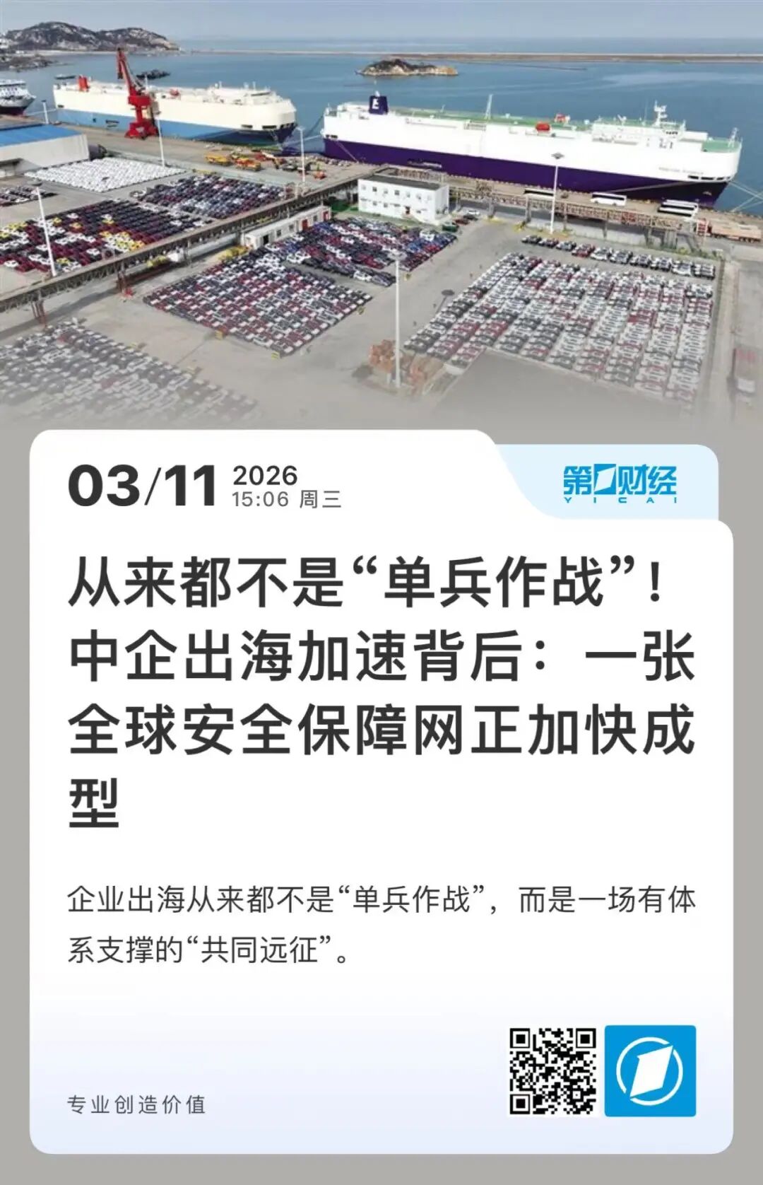 第一财经3月11日刊发《从来都不是“单兵作战”!中企出海加速背后:一张全球安全保障网正加快成型》,聚焦中企出海从"单兵作战"迈向体系化保障的最新进展。报道重点解析国家海外综合服务平台上线及地方实践进展,跳出企业个体视角,从国家战略高度剖析“产业链出海”新阶段的风险防控与合规经营需求,强调政企协同、全球合作而非“独角戏”,对“十五五”期间海外利益保护具有参考价值。