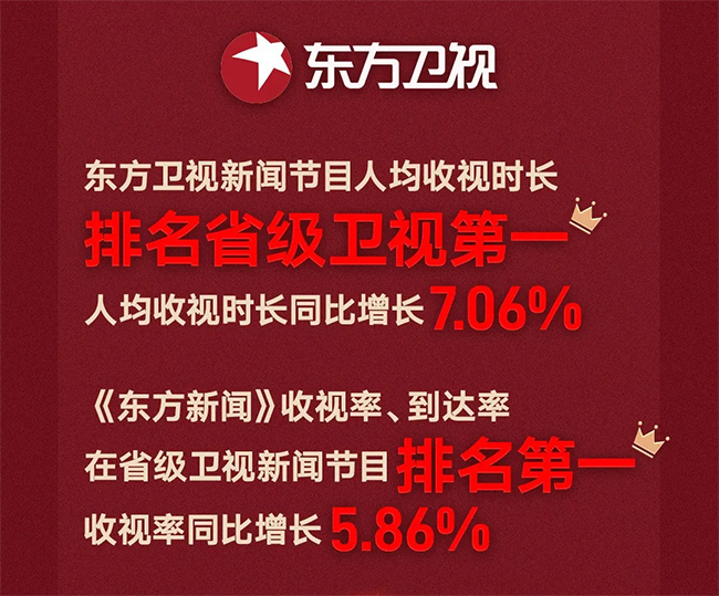 两会期间,东方卫视新闻节目人均收视时长排名省级卫视第一,观众人均收视分钟数同比增长7.06%。《东方新闻》收视率、到达率在省级卫视新闻节目排名第一(黄金时段),收视率同比增长5.86%。全国IPTV、互联网电视平台两会直播及点播内容播放次数达1.34亿次,播放时长2668万小时;其中SMG频道直播及两会报道等播放次数5588.5万次,播放总时长1024万小时。