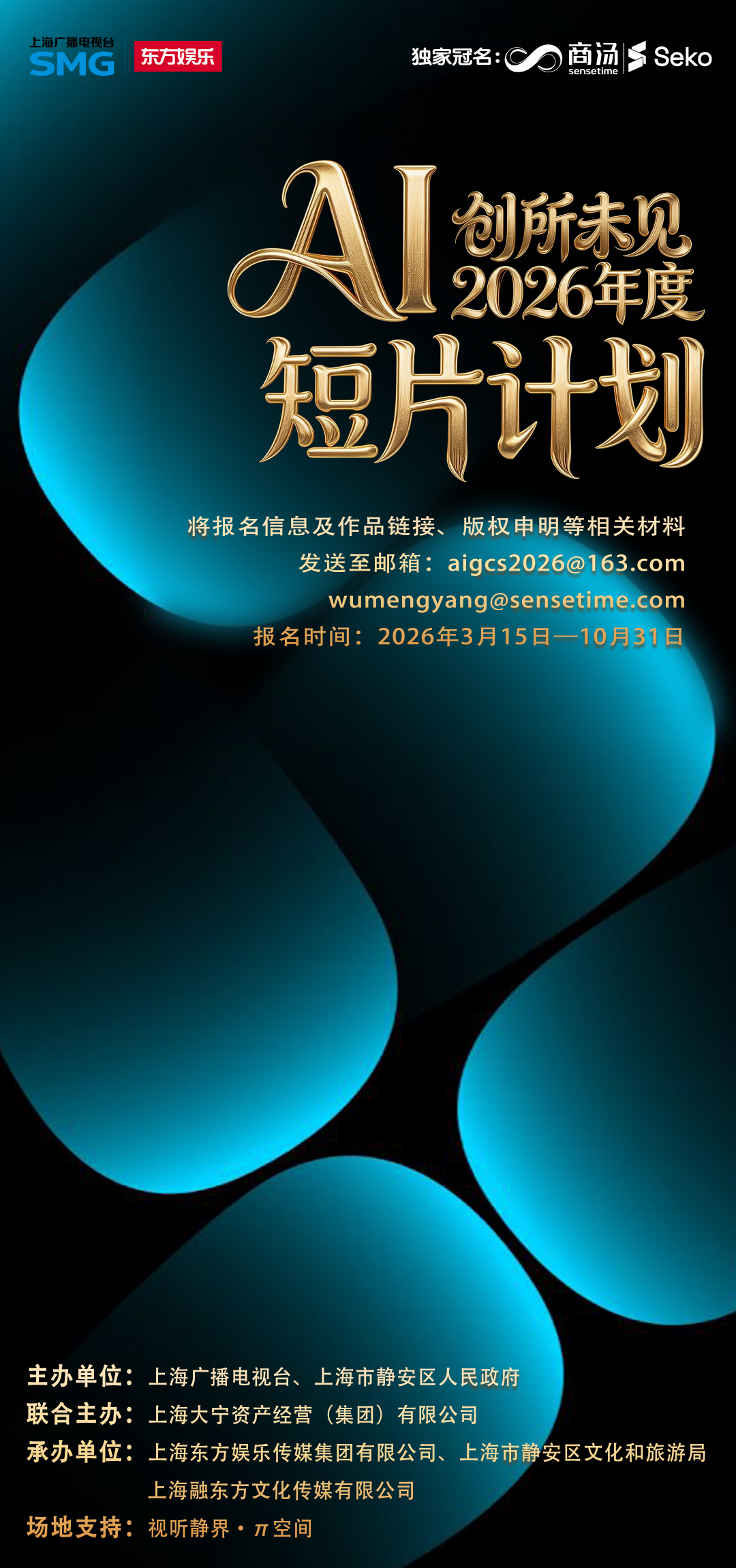 由上海广播电视台、上海市静安区人民政府主办,上海东方娱乐传媒集团有限公司承办,商汤科技独家冠名的“创所未见•2026年度AI短片计划”致力于打造全球性、专业性、引领性的文化科技赛事IP。本次计划将搭建全球AIGC创作者交流高地,挖掘优质AIGC内容与人才,推动人工智能与影视创作、文化传播深度融合,让中国文化魅力与上海城市精神通过AIGC技术对话世界。