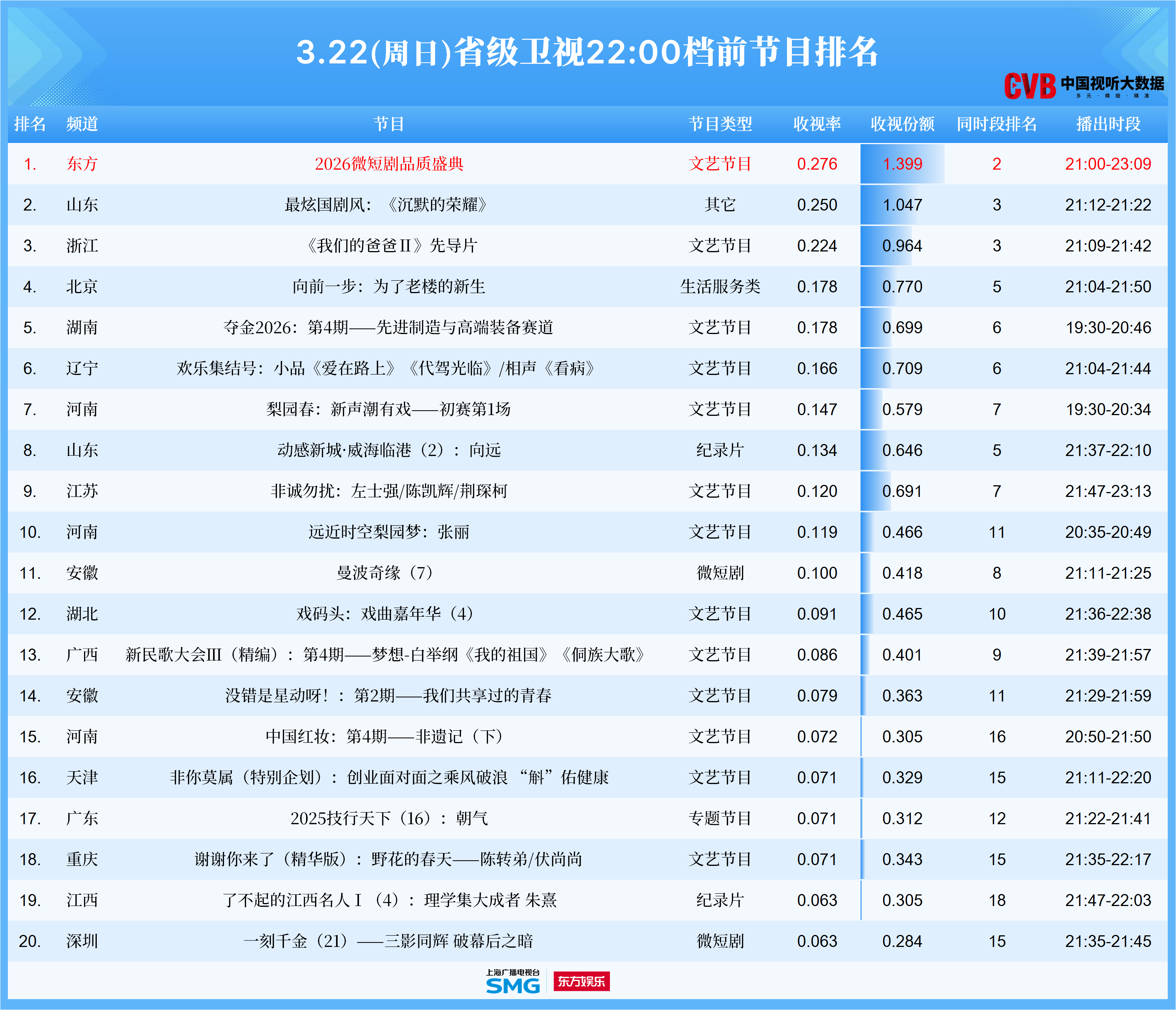2026上海影视创制大会系列活动——《2026微短剧品质盛典》3月22日晚在东方卫视播出。本次盛典以“质臻领航·微聚东方”为主题,汇聚微短剧领域台前幕后顶尖力量,共同见证行业从“流量驱动”到“品质驱动”华丽转身后的累累硕果。当晚节目CVB收视登顶第一,同比大涨45%,同时,酷云数娱、欢网大数据全国网收视双双第一。受众覆盖实现全圈层穿透,各年龄层观众占比均衡,大学以上学历观众超38%,盛典和红毯电视端累计收看人次近2000万。