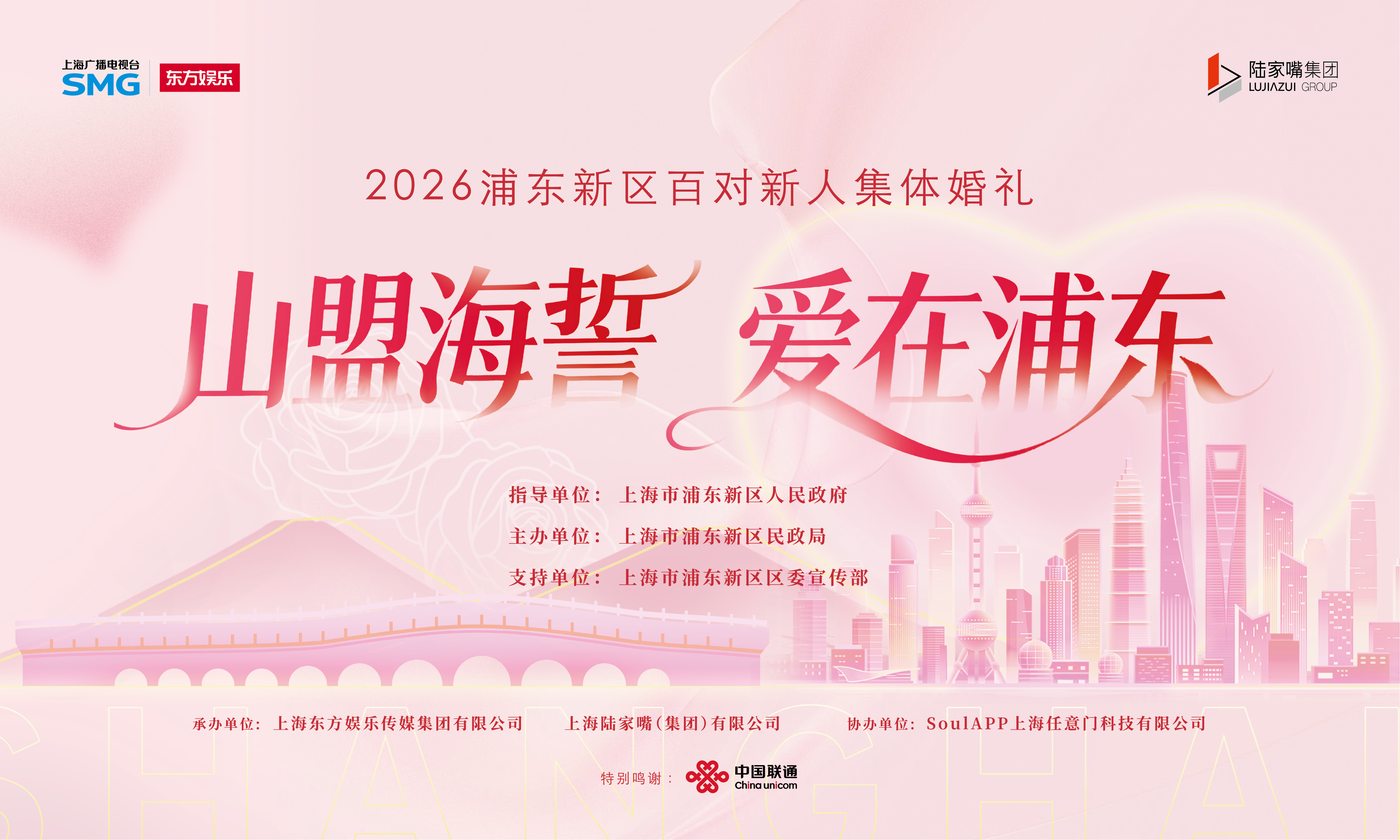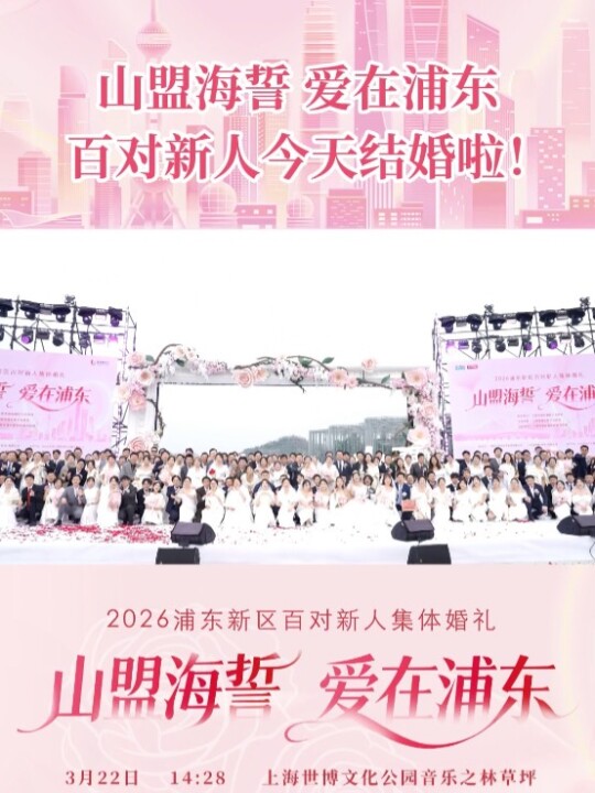 3月22日,由SMG东方娱乐全程策划并承制的“山盟海誓 爱在浦东”2026浦东新区百对新人集体婚礼在上海世博文化公园音乐之林草坪举行。本次活动由上海市浦东新区人民政府指导,上海市浦东新区民政局主办,上海市浦东区委宣传部全程支持。