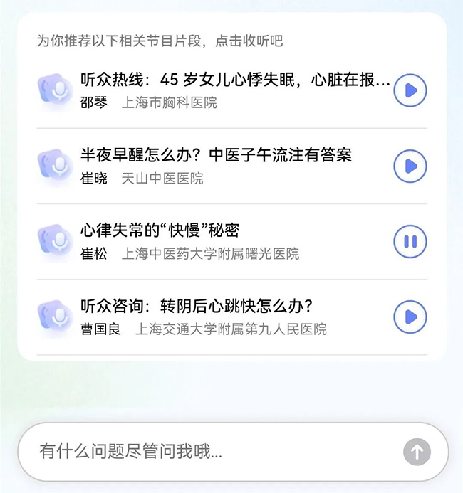 不止AI答疑,更有医生原声音频实录。这也是“小百岁”最独一无二的亮点——文字解答+音频实录,双重保障更安心。当你在“小百岁”提问健康问题,比如“高血压患者日常怎么控盐”“换季感冒如何护理”“中老年补钙误区”等,不仅能快速收到条理清晰、专业易懂的文字解答,还能同步获取节目对应的医生访谈音频。点开音频,就能听到医生和主持人的真实对话原声,没有滤镜、没有改编,原汁原味还原专家解读,让你听得明白、看得放心,彻底告别“伪健康知识”。
