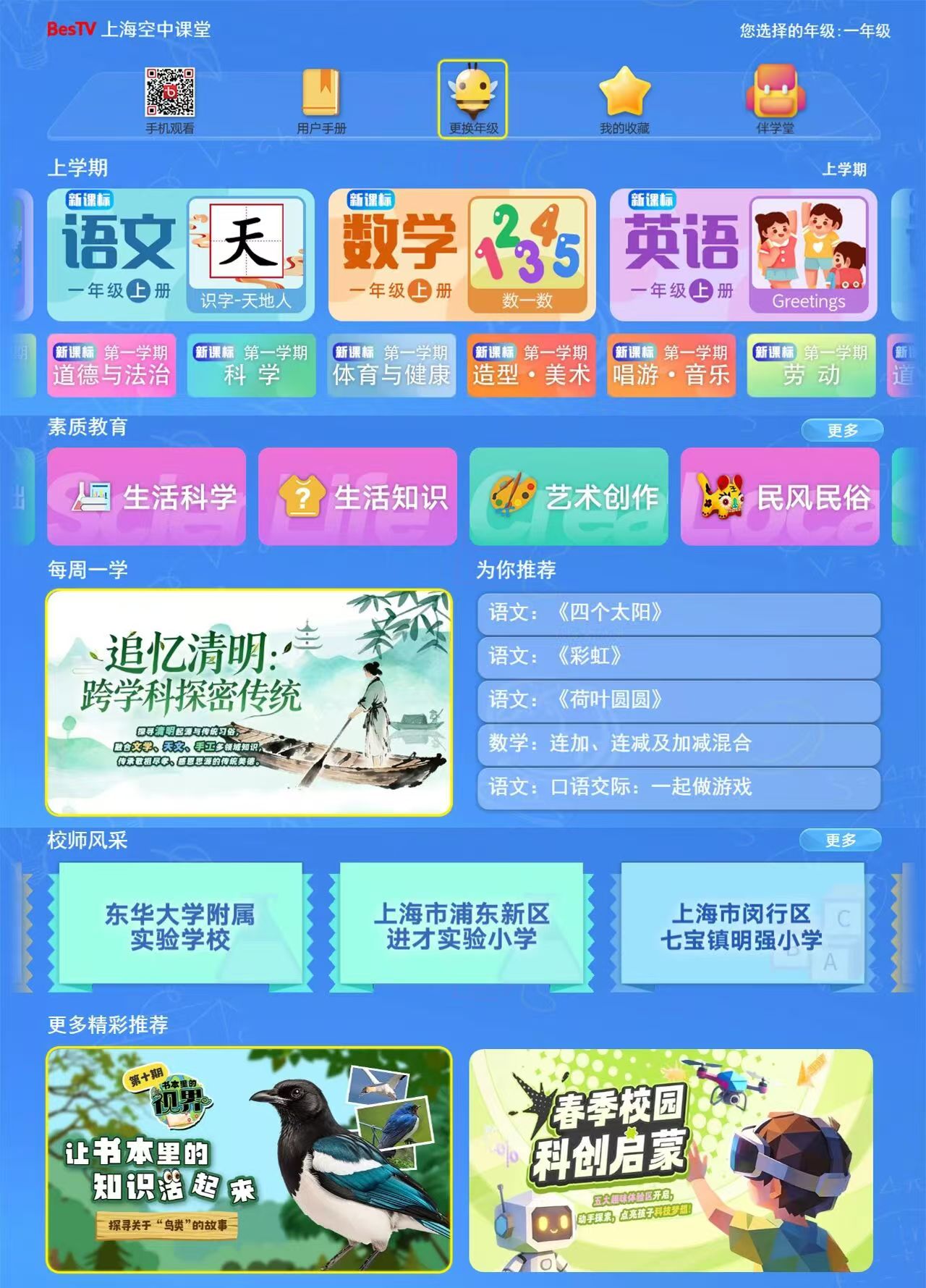 上线六年来,“上海空中课堂”持续迭代升级、深耕用户体验:从最初“直播+点播”的基础服务1.0版,到按年级、学科、知识点系统化归类编排;从推出12个年级专属首页、“校师佳课”优质师资专栏,到上线《名师面对面》、答题挑战、教育资讯等增值服务;再到实现课件文档大屏浏览、大屏英语有声互动等创新功能,平台不断满足课前预习、课后复习、自主学习、个性化提升等多元需求。截至目前,通过有线电视、IPTV、OTT等多渠道累计保障“空中课堂”安全播出超9410万小时,累计播出课程22233节,内容时长超过45万分钟,累计服务播放用户超过1亿台终端,播放访客人次近1.9亿,月均播放用户稳定在百万以上(140万用户/月),为上海基础教育数字化转型提供了坚实可靠的支撑。