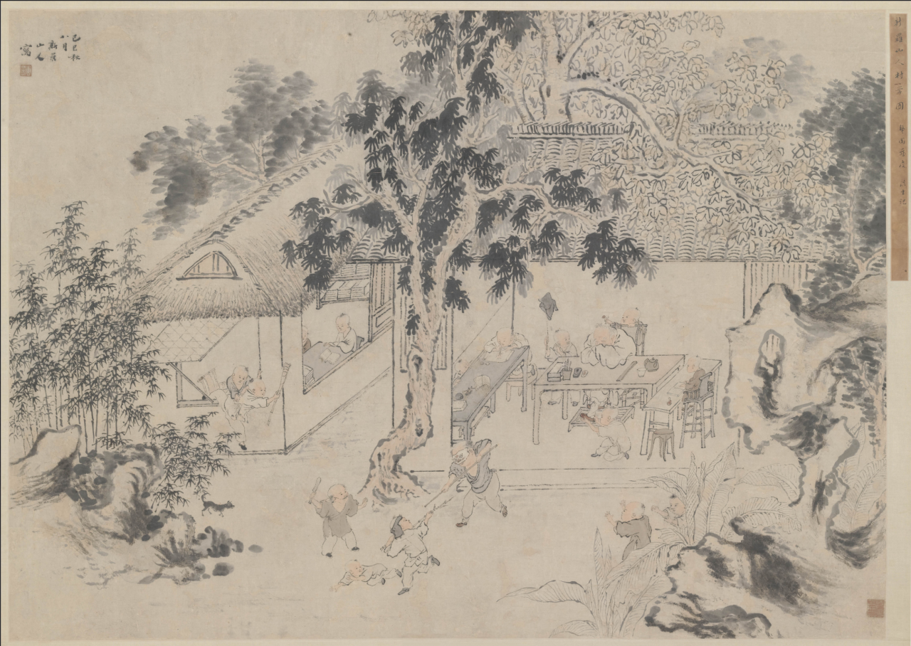 这幅现存最早以“闹学”为题的画作,背景藏着时代印记——宋明村学盛行,村夫子多为落第秀才,地位不高。出身寒微、幼年失学的仇英,以细腻笔触,将世俗生活的生动与童趣定格,让这份纯粹与鲜活,跨越数百年依旧动人。